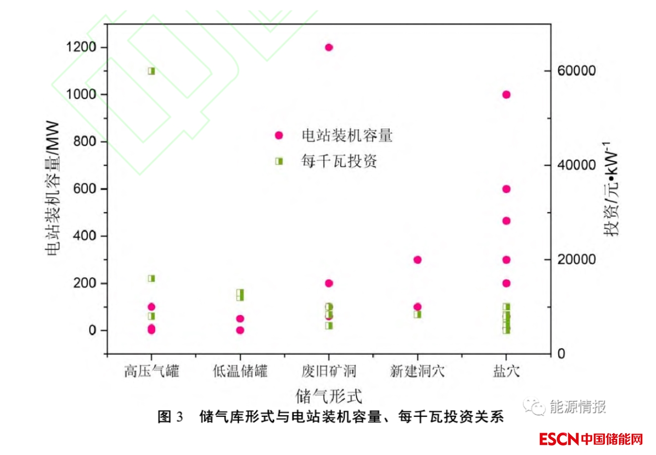 壓縮空氣儲能儲氣庫包括高壓氣罐、低溫儲罐、廢舊礦洞、新建洞穴、鹽穴等多種形式。儲氣庫形式與機(jī)組容量、每千瓦投資關(guān)系見圖3。圖3中,機(jī)組容量為電站總裝機(jī)容量,400~1200MW容量一般裝機(jī)2~4臺。對我國規(guī)劃、可研、在建、已建項(xiàng)目的統(tǒng)計分析可知,鹽穴儲氣庫機(jī)組容量多較大,其每千瓦投資相對較低;廢舊礦洞和新建洞穴也多可用作大型電站建設(shè),每千瓦投資稍高于鹽穴建庫;而低溫儲罐和高壓氣罐一般用于中小型電站,且多處于試驗(yàn)階段,現(xiàn)階段其每千瓦平均投資普遍比地下儲氣庫高。由于大型壓縮空氣儲能電站需要較大的儲氣空間,而地上儲氣罐(管)價格昂貴,現(xiàn)階段在建、已投產(chǎn)項(xiàng)目多采用地下儲氣庫,即鹽穴、新建洞穴和礦洞改造3種形式。本文就此3種形式的儲氣庫做重點(diǎn)論述。