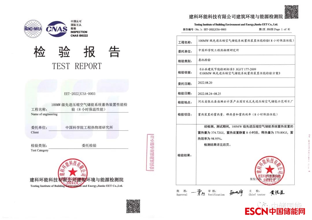 中國(guó)儲(chǔ)能網(wǎng)訊:近日,中國(guó)科學(xué)院工程熱物理所在大規(guī)模先進(jìn)壓縮空氣儲(chǔ)能示范系統(tǒng)研發(fā)方面取得重要進(jìn)展,河北省張家口國(guó)際首套100MW級(jí)先進(jìn)壓縮空氣儲(chǔ)能示范系統(tǒng)蓄熱裝置通過(guò)具有CNAS資質(zhì)的第三方測(cè)試,測(cè)試結(jié)果為蓄熱量達(dá)374.7 GJ,保溫8小時(shí)蓄熱效率為98.95%,保溫16小時(shí)蓄熱效率為98.73%,為目前壓縮空氣儲(chǔ)能蓄熱裝置效率最高記錄,達(dá)到國(guó)際領(lǐng)先水平。