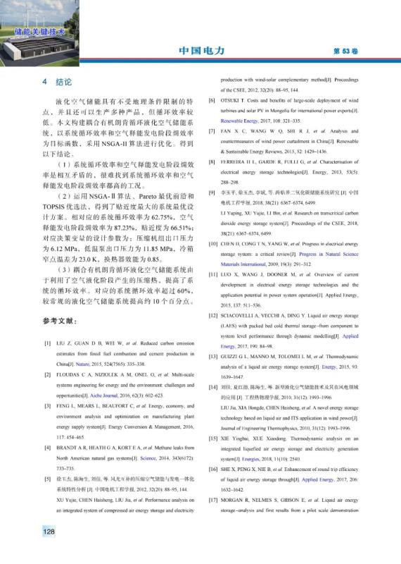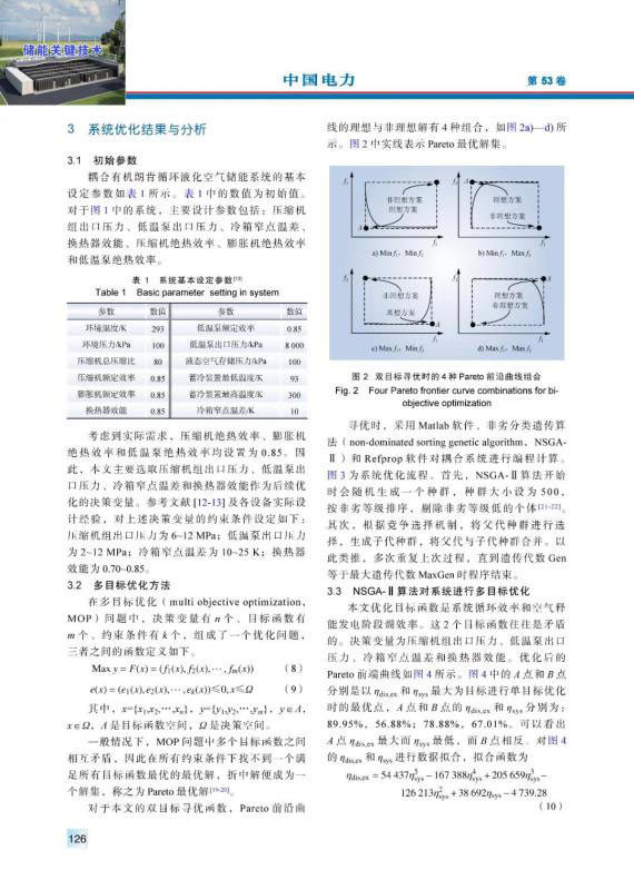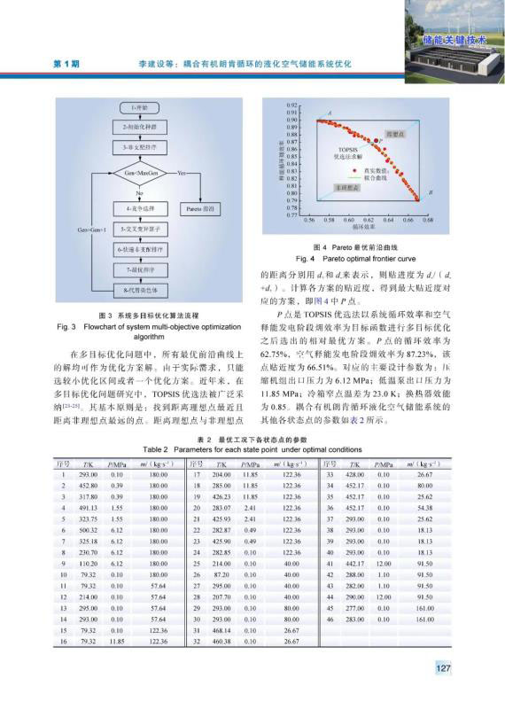 儲能是解決風能和太陽能等可再生能源發(fā)電間歇性和不穩(wěn)定性的重要技術途徑。針對常規(guī)液化空氣儲能系統(tǒng)循環(huán)效率較低的問題,引入有機朗肯循環(huán)以利用空氣液化階段產生的壓縮熱。構建耦合有機朗肯循環(huán)的液化空氣儲能系統(tǒng),以系統(tǒng)循環(huán)效率和空氣釋能發(fā)電階段?效率為目標函數,以壓縮機組出口壓力、低溫泵出口壓力、冷箱窄點溫差和換熱器效能為決策變量,運用非劣分類遺傳算法NSGA-Ⅱ進行多目標優(yōu)化。繪制Pareto最優(yōu)前沿曲線,采用TOPSIS優(yōu)選法,得到貼近度最大的系統(tǒng)最優(yōu)設計方案,與之對應的系統(tǒng)循環(huán)效率為62.75%。