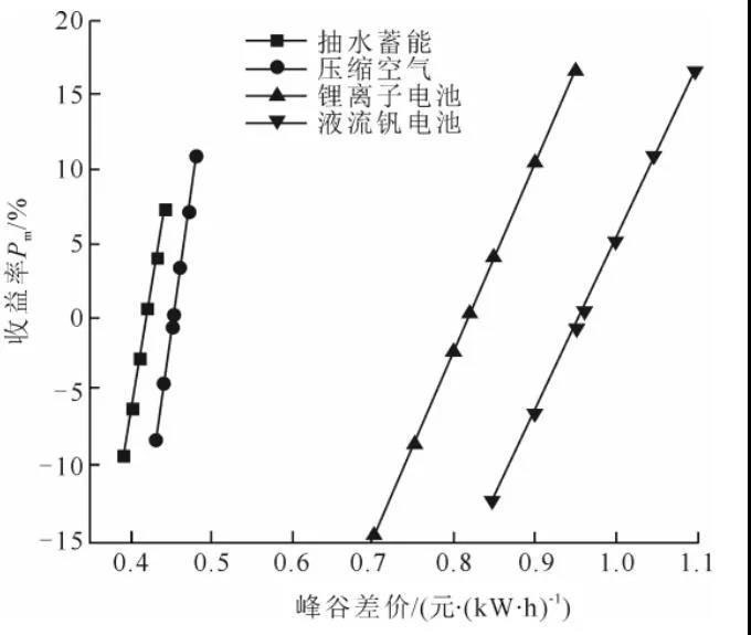 (不同峰谷電價(jià)差下各儲(chǔ)能系統(tǒng)的收益率)