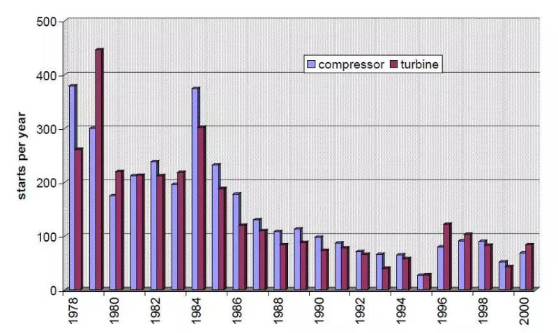 圖3給出了德國漢特福儲能電站的壓縮機(jī)組及膨脹機(jī)組每年的啟動次數(shù)。在投運之初,該儲能電站主要充當(dāng)緊急備用電源角色,當(dāng)電網(wǎng)內(nèi)其他電源出現(xiàn)故障時,向電網(wǎng)提供有功輸出支持,機(jī)組的平均啟動可靠性為97.6%,截止目前該儲能電站仍在運營[19, 20]。在1978年首次投用時,儲能電站的壓縮機(jī)組就啟動將近400次,膨脹發(fā)電機(jī)組啟動次數(shù)也超過250次;到1979年,膨脹發(fā)電機(jī)組啟動次數(shù)達(dá)到了450次左右。自1985年之后,漢特福壓縮空氣儲能電站所在的電網(wǎng)接入了大容量的抽水蓄能電站,電網(wǎng)減少了對壓縮空氣儲能電站的調(diào)用頻次。
