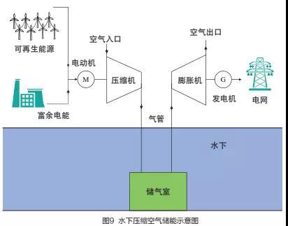 水下壓縮空氣儲能屬于等壓壓縮空氣儲能的一種,該技術(shù)將壓縮空氣存儲在水下(如海底和湖底),利用水的靜壓特性保持儲氣的壓力恒定,保證壓縮機出口及膨脹機入口壓力恒定,從而使壓縮機和膨脹機始終工作在額定工況附近,不需要通過減壓閥進行壓力調(diào)整,減少能量損耗,提高系統(tǒng)效率。該系統(tǒng)不需要在儲氣空間保持一定的最小氣壓,使得空氣壓縮能可利用比率更高。此外,該系統(tǒng)安全性相對較高,即使發(fā)生失效事故,造成的破壞與危害也較小。