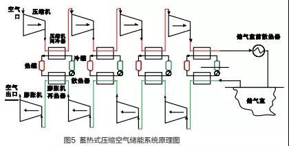 蓄熱式壓縮空氣儲能又被稱作先進絕熱壓縮空氣儲能,其原理同絕熱壓縮空氣儲能類似,區(qū)別在于該系統(tǒng)在壓縮過程級間換熱及儲熱,絕熱壓縮空氣儲能在全部壓縮過程結(jié)束后儲熱。相較于絕熱壓縮空氣儲能,蓄熱式壓縮空氣儲能系統(tǒng)的儲熱溫度及儲能密度較低,但其壓縮機耗能減小,且對于壓縮機材料要求不高。該系統(tǒng)缺點在于增加了多級換熱及儲熱,系統(tǒng)初投資有所增加。