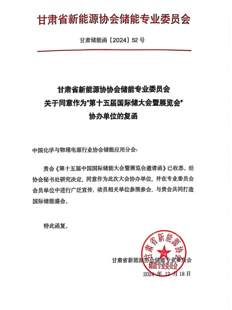 中國(guó)儲(chǔ)能網(wǎng)訊:近日,甘肅省新能源協(xié)會(huì)儲(chǔ)能專業(yè)委員會(huì)復(fù)函中國(guó)化學(xué)與物理電源行業(yè)協(xié)會(huì)儲(chǔ)能應(yīng)用分會(huì),同意作為第十五屆中國(guó)國(guó)際儲(chǔ)能大會(huì)暨展覽會(huì)(CIES2025)協(xié)辦單位,并在專業(yè)委員會(huì)會(huì)員單位中進(jìn)行廣泛宣傳,動(dòng)員相關(guān)單位參展參會(huì),與中國(guó)化學(xué)與物理電源行業(yè)協(xié)會(huì)儲(chǔ)能應(yīng)用分會(huì)共同打造這場(chǎng)國(guó)際儲(chǔ)能盛會(huì)。