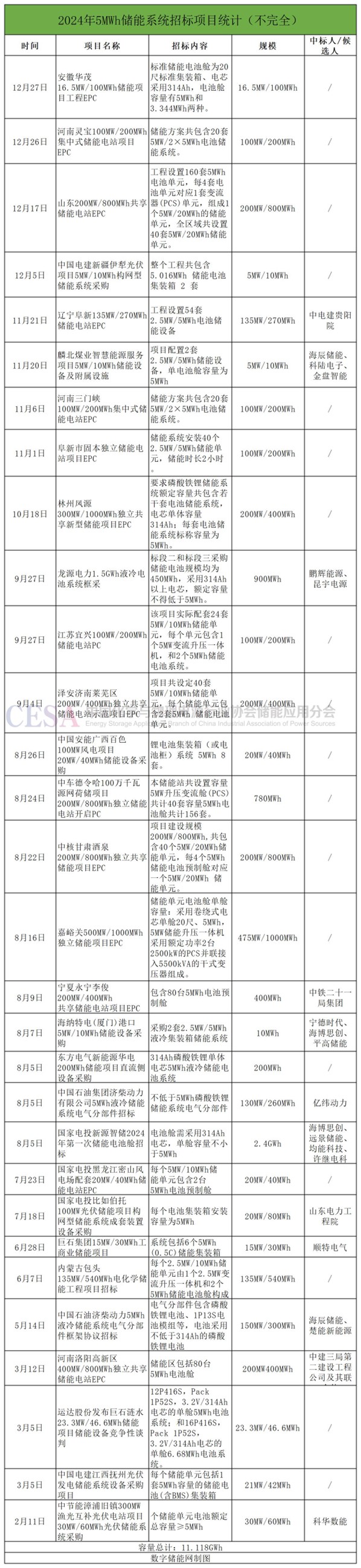 在招投標(biāo)市場(chǎng),5MWh儲(chǔ)能系統(tǒng)受認(rèn)可程度逐漸升高,據(jù)中國(guó)儲(chǔ)能網(wǎng)不完全統(tǒng)計(jì),2024年,招投標(biāo)市場(chǎng)涉及5MWh儲(chǔ)能系統(tǒng)的EPC、PC、設(shè)備等招標(biāo)項(xiàng)目共30個(gè),容量規(guī)模為11.118GWh。