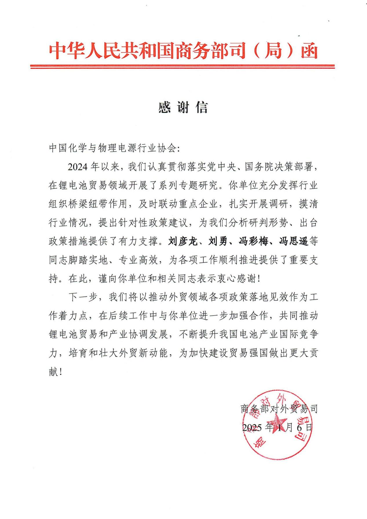 中國儲能網訊:2025年1月6日,商務部對外貿易司向我會致感謝信。