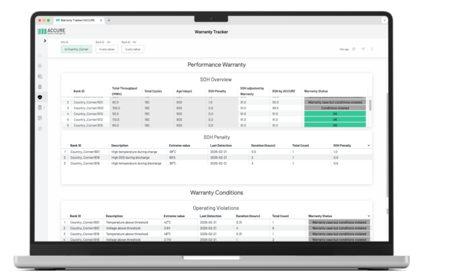 去年12月,ACCURE Battery Intelligence公司為其軟件平臺推出了一項新的預測分析功能——保修跟蹤器,該功能可以通過運行數(shù)據(jù)持續(xù)監(jiān)控電池儲能系統(tǒng)。