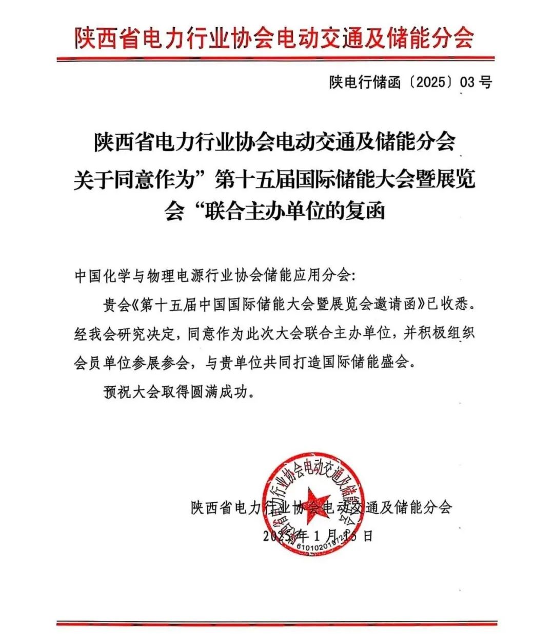 中國(guó)儲(chǔ)能網(wǎng)訊:近日,陜西省電力行業(yè)協(xié)會(huì)電動(dòng)交通及儲(chǔ)能分會(huì)復(fù)函中國(guó)化學(xué)與物理電源行業(yè)協(xié)會(huì)儲(chǔ)能應(yīng)用分會(huì),同意作為第十五屆中國(guó)國(guó)際儲(chǔ)能大會(huì)暨展覽會(huì)(CIES2025)聯(lián)合主辦單位,并積極組織會(huì)員單位參展參會(huì),與中國(guó)化學(xué)與物理電源行業(yè)協(xié)會(huì)儲(chǔ)能應(yīng)用分會(huì)共同打造這場(chǎng)國(guó)際儲(chǔ)能盛會(huì)。