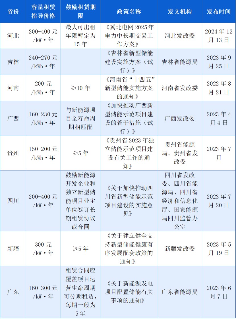 2024年8月,河北省發(fā)改委發(fā)布的《關(guān)于促進(jìn)獨立儲能加快發(fā)展有關(guān)事項的通知》明確提出,自2024年9月30日起,未開工新能源項目需配建儲能的,鼓勵優(yōu)先通過租賃方式配置儲能,不再單獨配建容量低于10萬千瓦/20萬千瓦時的儲能設(shè)施。獨立儲能可在同一省級電網(wǎng)區(qū)域向新能源項目出租容量,不受市域限制。12月,河北發(fā)改委發(fā)布《冀北電網(wǎng)2025年電力中長期交易工作方案》,其中明確,獨立儲能參與容量租賃交易,2025年交易價格上、下限暫定400、200元/千瓦·年。交易合同價格經(jīng)購售雙方協(xié)商一致后,每年可修改一次。