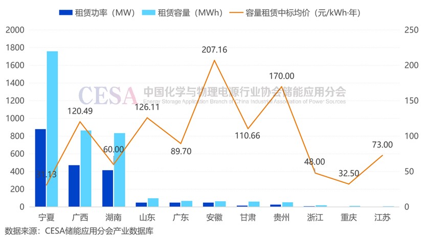 容量租賃服務(wù)的市場化競標(biāo)主要發(fā)生在寧夏、廣西、湖南、山東等省份,隨著儲能投運規(guī)模的不斷增多,容量租賃市場競爭也越來越白熱化。其中,寧夏共22個項目尋租,總規(guī)模達(dá)880.67MW/1761.34MWh,占總租賃容量的45.69%,是容量租賃招標(biāo)需求最大的省份。此外,廣西、湖南容量租賃招標(biāo)規(guī)模也均超過800MWh。
