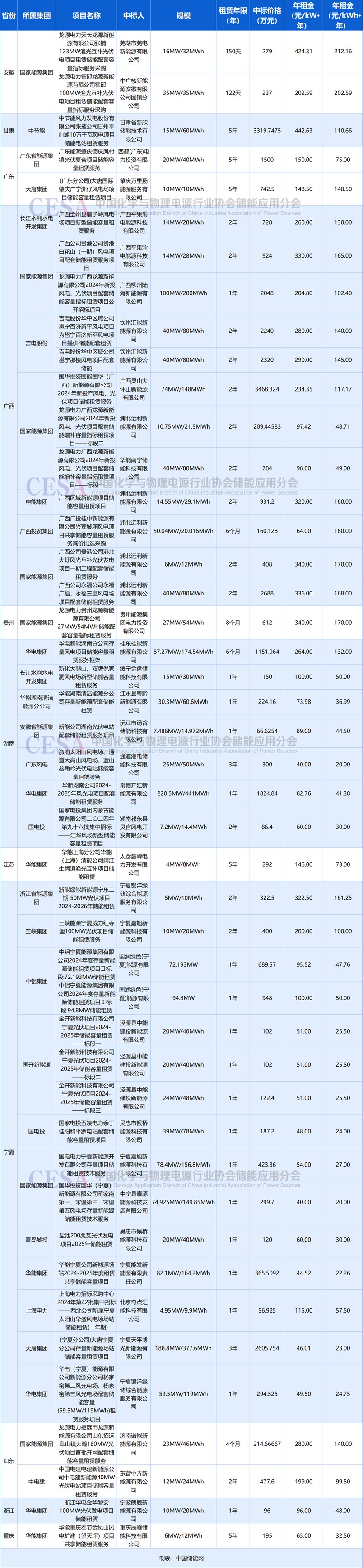 據(jù)CESA儲能應(yīng)用分會產(chǎn)業(yè)數(shù)據(jù)庫不完全統(tǒng)計,2024年以來,國家能源集團(tuán)、華電集團(tuán)、大唐集團(tuán)、中鋁集團(tuán)、華能集團(tuán)、國電投等集團(tuán)及其下屬單位已完成超60個儲能容量租賃服務(wù)采招項目,總租賃規(guī)模超1.98GW/3.85GWh,較之去年需求容量規(guī)模上漲194.7%,容量租賃服務(wù)市場興起。