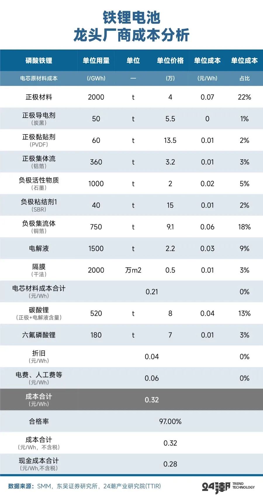 根據(jù)東吳證券此前分析測算,按照碳酸鋰8萬價格測算,龍頭鐵鋰電芯成本預計0.32元/Wh左右(不含稅),龍頭三元523電芯成本預計0.45元/Wh左右(不含稅);而二線廠商鐵鋰與三元電芯成本約分別為0.37/Wh和0.50/Wh左右。