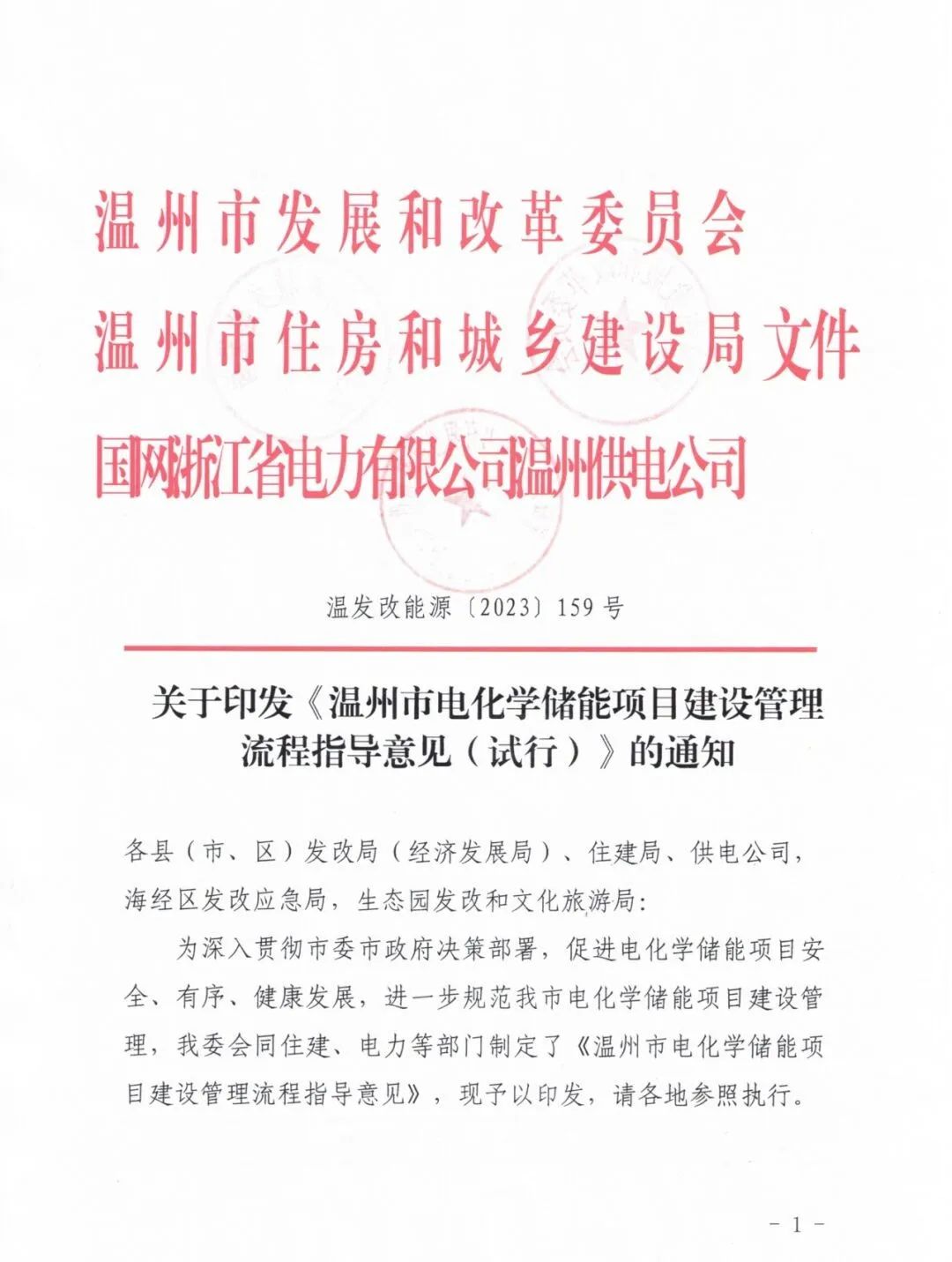 中國儲能網(wǎng)訊:12月27日,溫州市發(fā)展和改革委員會、溫州市住房和城鄉(xiāng)建設局、國網(wǎng)浙江省電力有限公司溫州供電公司等多部門聯(lián)合印發(fā)《溫州市電化學儲能項目建設管理流程指導意見(試行)》(以下簡稱“指導意見”)。