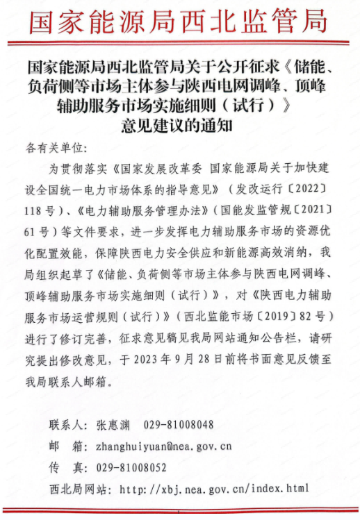 中國儲(chǔ)能網(wǎng)訊:8月25日,西北能監(jiān)局就《儲(chǔ)能、負(fù)荷側(cè)等市場(chǎng)主體參與陜西電網(wǎng)調(diào)峰、頂峰輔助服務(wù)市場(chǎng)實(shí)施細(xì)則(試行)》征求意見。細(xì)則明確,儲(chǔ)能調(diào)峰交易的報(bào)價(jià)0-550元/MWh,頂峰交易的報(bào)價(jià)0-1500元/MWh。