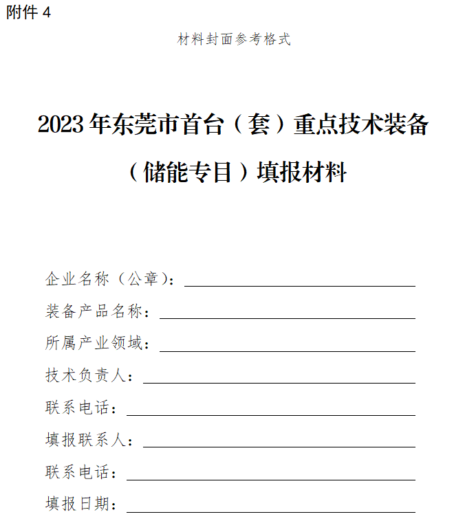 請相關(guān)儲能裝備制造業(yè)企業(yè)按要求認(rèn)真填寫《東莞市首臺(套)重點(diǎn)技術(shù)裝備(儲能專目)情況表》(見附件2),并將附件2及相關(guān)證明附件裝訂成冊。具體如下: