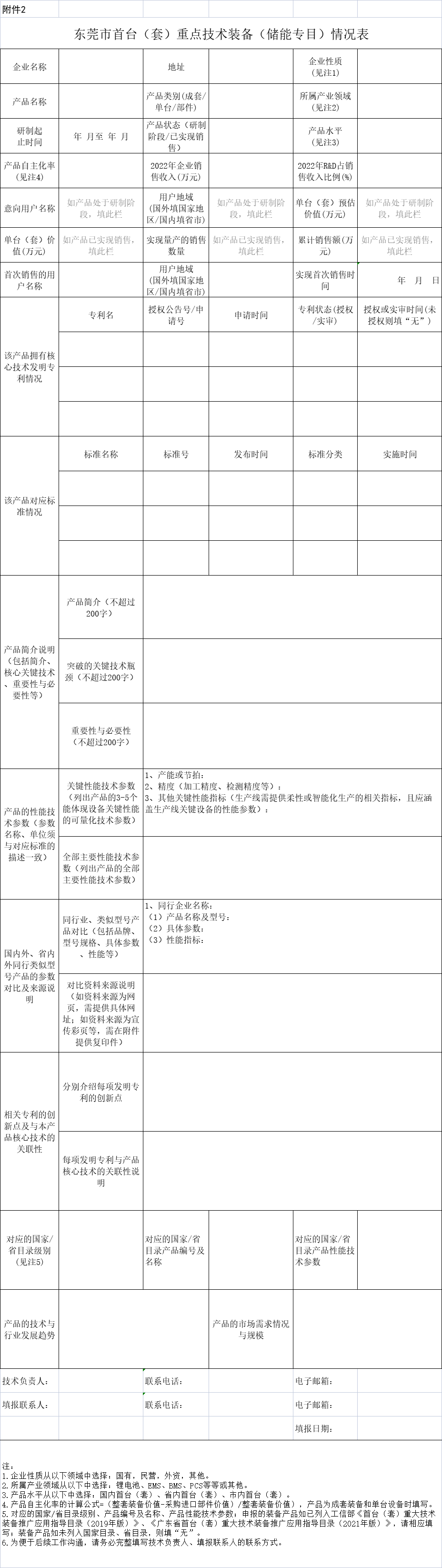 1、《東莞市首臺(套)重點(diǎn)技術(shù)裝備(儲能專目)情況表》(按照裝備產(chǎn)品處于研制階段、已實(shí)現(xiàn)首次銷售分別填寫不同表格);