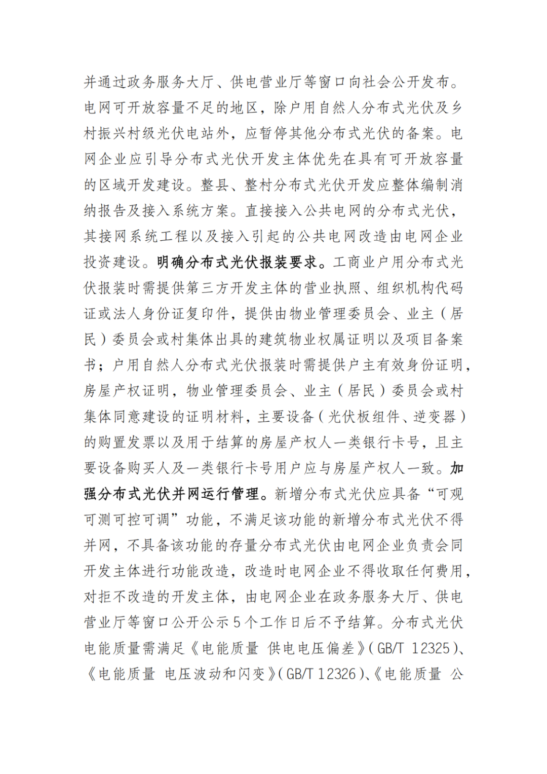 此外,電網(wǎng)企業(yè)應(yīng)在每季度前7個(gè)工作日完成轄區(qū)分布式光伏電網(wǎng)可開(kāi)放容量滾動(dòng)測(cè)算,并通過(guò)政務(wù)服務(wù)大廳、供電營(yíng)業(yè)廳等窗口向社會(huì)公開(kāi)發(fā)布。戶(hù)用自然人分布式光伏、鄉(xiāng)村振興村級(jí)光伏電站:所在地供電企業(yè)應(yīng)按照“先接入后改造”的原則進(jìn)行接網(wǎng)手續(xù)辦理工商業(yè)戶(hù)用分布式光伏:優(yōu)先按照“分散建設(shè)、匯集接入”的方式,結(jié)合配電網(wǎng)可開(kāi)放容量情況進(jìn)行開(kāi)發(fā)建設(shè)。電網(wǎng)可開(kāi)放容量不足的地區(qū),除戶(hù)用自然人分布式光伏及鄉(xiāng)村振興村級(jí)光伏電站外,應(yīng)暫停其他分布式光伏的備案。