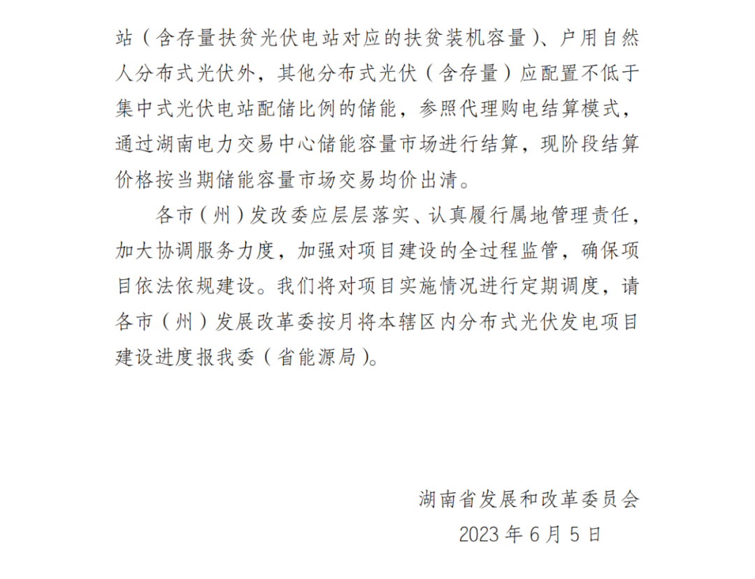 除鄉(xiāng)村振興村級(jí)光伏電站(含存量扶貧光伏電站對(duì)應(yīng)的扶貧裝機(jī)容量)、戶(hù)用自然人分布式光伏外,其他分布式光伏(含存量)應(yīng)配置不低于集中式光伏電站配儲(chǔ)比例的儲(chǔ)能,參照代理購(gòu)電結(jié)算模式,通過(guò)湖南電力交易中心儲(chǔ)能容量市場(chǎng)進(jìn)行結(jié)算,現(xiàn)階段結(jié)算價(jià)格按當(dāng)期儲(chǔ)能容量市場(chǎng)交易均價(jià)出清。