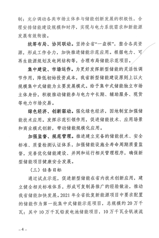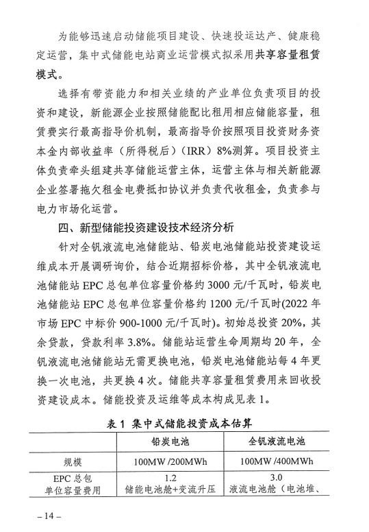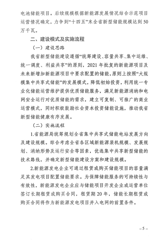 該方案明確了新型儲(chǔ)能建設(shè)遵循“統(tǒng)籌建設(shè)、容量共享、集中運(yùn)維、統(tǒng)一調(diào)度、利益共享”的原則,2021 年批復(fù)的新能源項(xiàng)目及未來新增加新能源項(xiàng)目中要求配置的儲(chǔ)能,原則上按照“大規(guī)模集中共享式儲(chǔ)能”的發(fā)展模式,降低初始投資。
