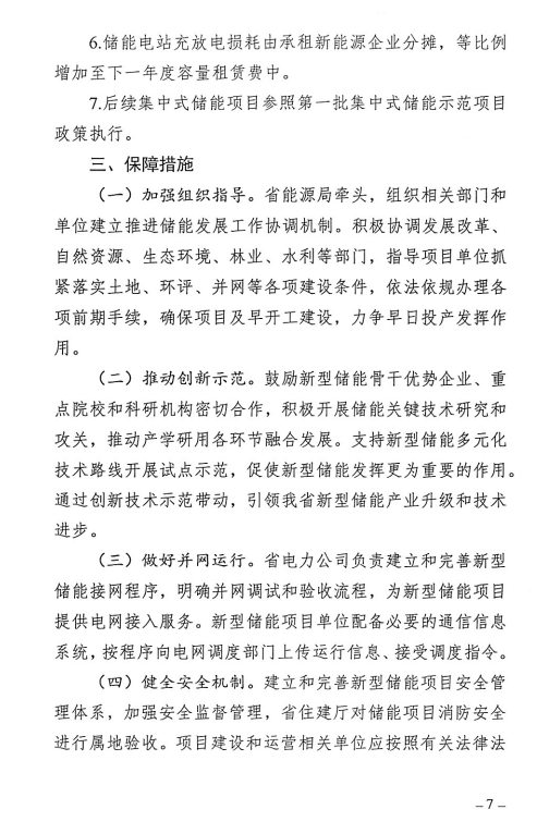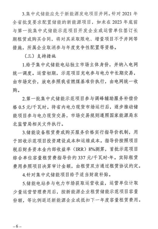 并網(wǎng)方面,集中式儲(chǔ)能應(yīng)先于新能源發(fā)電項(xiàng)目并網(wǎng)。針對(duì) 2021 年全省批復(fù)要求配置儲(chǔ)能的新能源項(xiàng)目,如未在 2023 年底前與第一批集中式儲(chǔ)能示范項(xiàng)目開發(fā)企業(yè)或運(yùn)營單位簽訂長期租賃或購買合同,將對(duì)其采取限電、增量項(xiàng)目不予并網(wǎng)等措施,所屬企業(yè)取消參與年度競爭性配置等資格。
