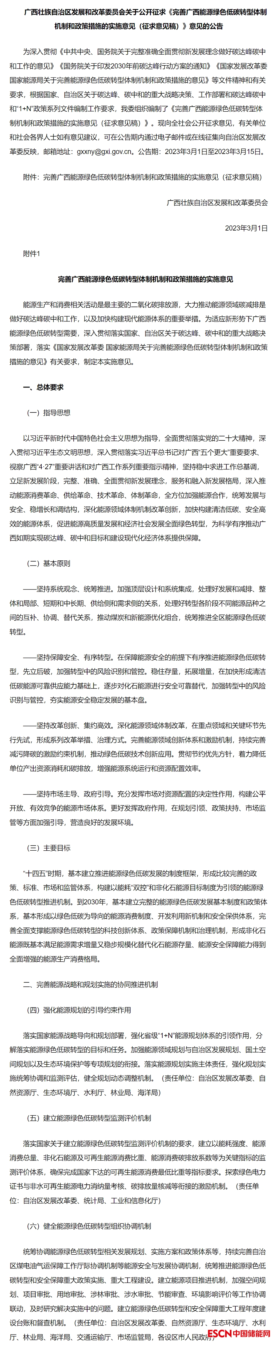 中國(guó)儲(chǔ)能網(wǎng)訊:3月1日,廣西壯族自治區(qū)發(fā)改委發(fā)布《完善廣西能源綠色低碳轉(zhuǎn)型體制機(jī)制和政策措施的實(shí)施意見(jiàn)(征求意見(jiàn)稿)》(以下簡(jiǎn)稱(chēng)《征求意見(jiàn)稿》)的公告。