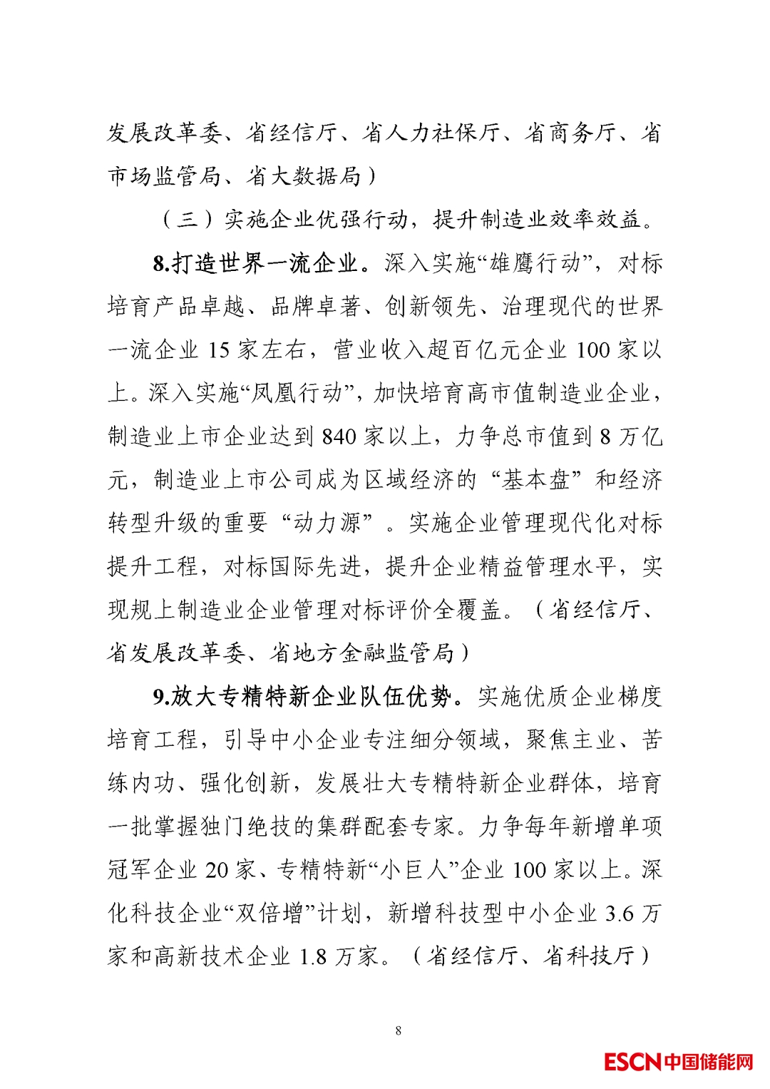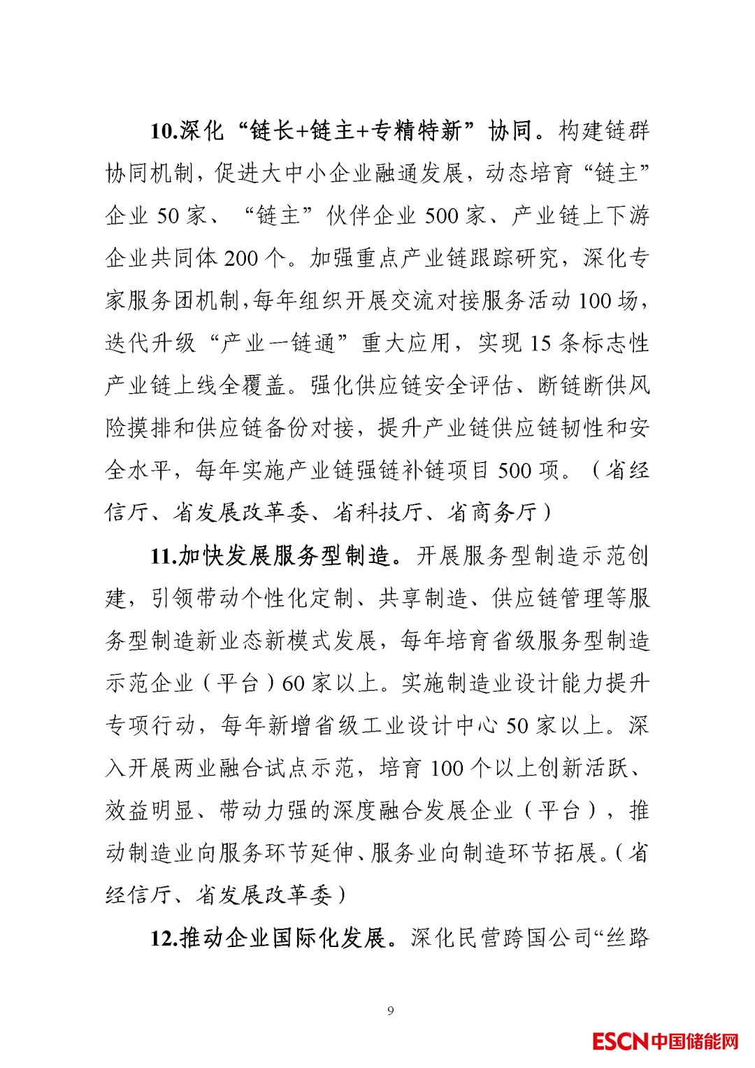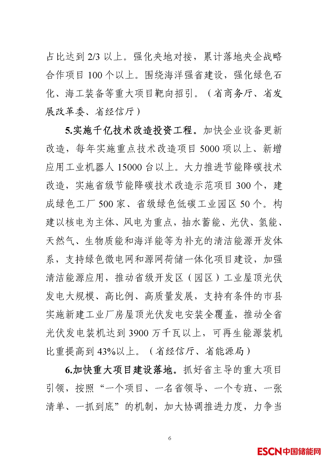 實(shí)施千億技術(shù)改造投資工程。加快企業(yè)設(shè)備更新改造,每年實(shí)施重點(diǎn)技術(shù)改造項(xiàng)目5000項(xiàng)以上、新增應(yīng)用工業(yè)機(jī)器人15000臺(tái)以上。大力推進(jìn)節(jié)能降碳技術(shù)改造,實(shí)施省級(jí)節(jié)能降碳技術(shù)改造示范項(xiàng)目300個(gè),建成綠色工廠500家、省級(jí)綠色低碳工業(yè)園區(qū)50個(gè)。構(gòu)建以核電為主體、風(fēng)電為重點(diǎn),抽水蓄能、光伏、氫能、天然氣、生物質(zhì)能和海洋能等為補(bǔ)充的清潔能源開發(fā)體系,支持綠色微電網(wǎng)和源網(wǎng)荷儲(chǔ)一體化項(xiàng)目建設(shè),加強(qiáng)清潔能源應(yīng)用,推動(dòng)省級(jí)開發(fā)區(qū)(園區(qū))工業(yè)屋頂光伏發(fā)電大規(guī)模、高比例、高質(zhì)量發(fā)展,支持有條件的市縣實(shí)施新建工業(yè)廠房屋頂光伏發(fā)電安裝全覆蓋,推動(dòng)全省光伏發(fā)電裝機(jī)達(dá)到 3900 萬千瓦以上,可再生能源裝機(jī)比重提高到 43%以上。