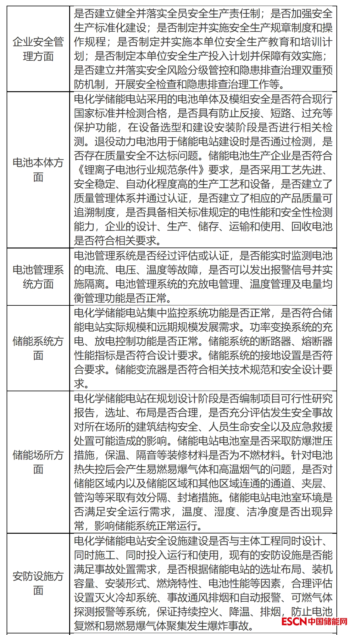 電池本身安全風險隱患、電池管理系統(tǒng)安全風險隱患、儲能系統(tǒng)安全風險隱患、儲能場所安全風險隱患、安防設施風險隱患、應急處置風險隱患、建設安裝和運維管理風險隱患等。(詳見檢查評估細則)