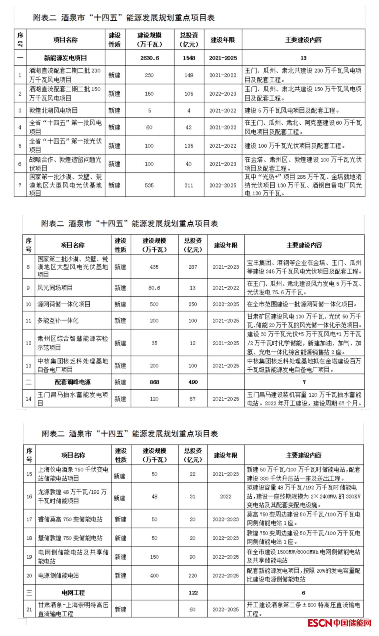 值得注意的是,酒泉市還發(fā)布了“十四五”能源發(fā)展規(guī)劃的重點(diǎn)項(xiàng)目表。其中新能源發(fā)電項(xiàng)目共2630.6萬(wàn)千瓦,總投資1548億元。主要建設(shè)項(xiàng)目包括:酒湖直流配套二期二批風(fēng)電項(xiàng)目、國(guó)家第一批沙漠、戈壁、荒漠地區(qū)大型風(fēng)電光伏基地項(xiàng)目以及全省“十四五”第一批光伏、風(fēng)電項(xiàng)目等13個(gè)大型新能源項(xiàng)目。具體情況如下: