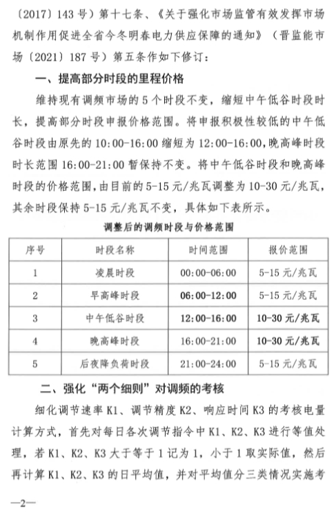 中國儲(chǔ)能網(wǎng)訊:近日,山西能源監(jiān)管辦發(fā)布關(guān)于修訂電力調(diào)頻輔助服務(wù)市場有關(guān)規(guī)定條款的通知,提高部分時(shí)段里程價(jià)格,強(qiáng)化“兩個(gè)細(xì)則”對(duì)調(diào)頻的考核。