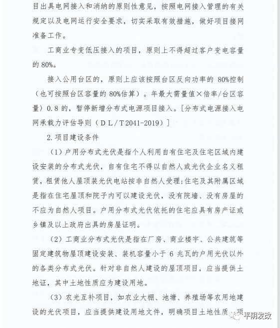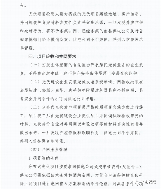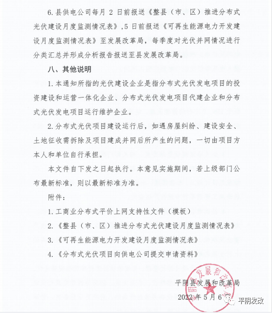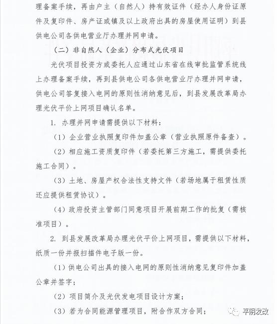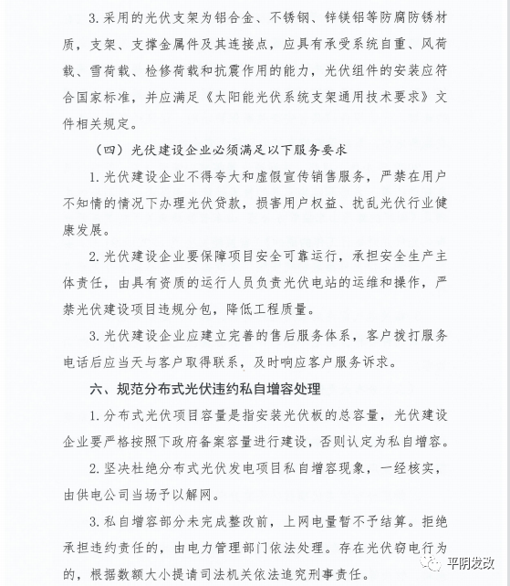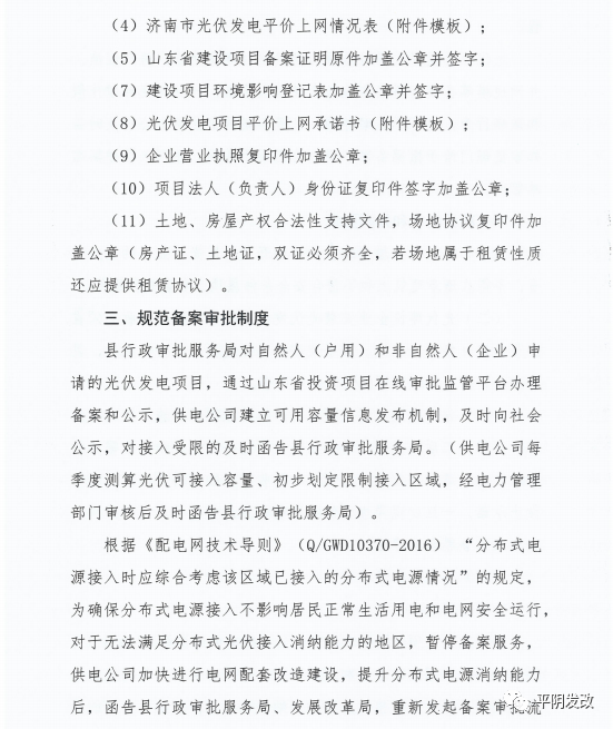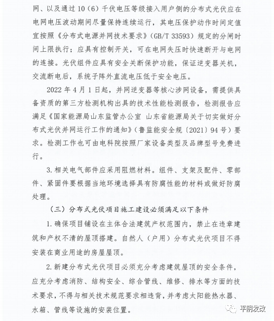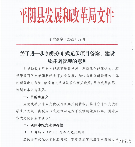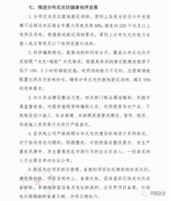 中國(guó)儲(chǔ)能網(wǎng)訊:日前,山東省濟(jì)南市平陰縣發(fā)改局印發(fā)《關(guān)于進(jìn)一步加強(qiáng)分布式光伏項(xiàng)目備案、建設(shè)及并網(wǎng)管理的意見(jiàn)》,文件提出分布式光伏應(yīng)就地就近消納。原則上各類光伏總計(jì)開發(fā)規(guī)模不應(yīng)超過(guò)本區(qū)域全年最大用電負(fù)荷60%,避免向220千伏及以上電網(wǎng)反送電。根據(jù)就地就近消納要求,原則上分布式光伏電力在接入電壓等級(jí)及以下電網(wǎng)范圍內(nèi)消納。
