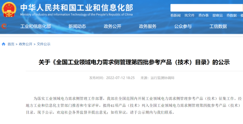 為落實(shí)工業(yè)領(lǐng)域電力需求側(cè)管理工作部署,我部在全國范圍內(nèi)開展工業(yè)領(lǐng)域電力需求側(cè)管理參考產(chǎn)品(技術(shù))征集工作。經(jīng)地方工業(yè)和信息化主管部門推薦和專家評審,擬將41項(xiàng)產(chǎn)品(技術(shù))列入全國工業(yè)領(lǐng)域電力需求側(cè)管理第四批參考產(chǎn)品(技術(shù))目錄。現(xiàn)予公示,歡迎社會(huì)各界監(jiān)督并提出意見;如有異議,請于公示期內(nèi)與我們聯(lián)系。
