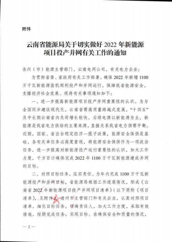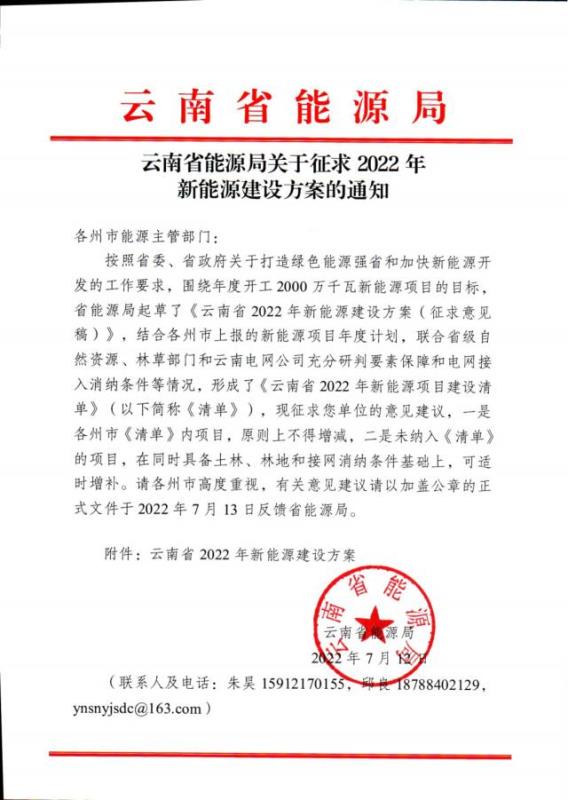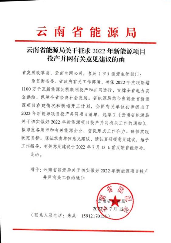 中國儲能網(wǎng)訊:7月13日,云南省能源局發(fā)布《關(guān)于征求2022年新能源項目投產(chǎn)并網(wǎng)有關(guān)意見建議的函》。根據(jù)《關(guān)于征求2022年新能源項目投產(chǎn)并網(wǎng)有關(guān)意見建議的函》,確保2022年新增1100萬千瓦新能源裝機順利投產(chǎn)和并網(wǎng)運行。