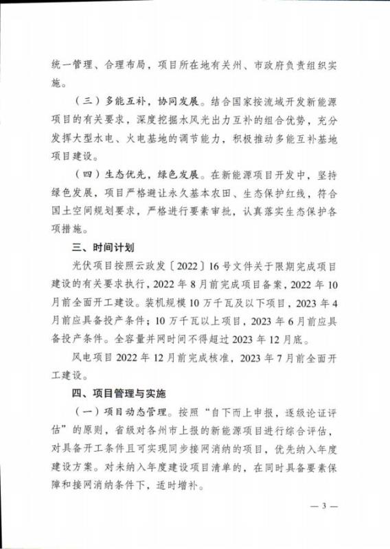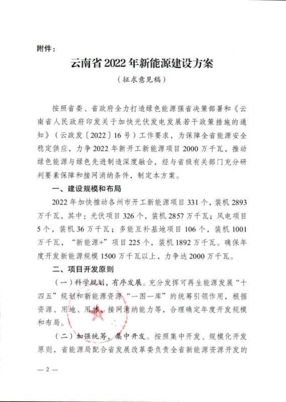 同日,云南省能源局還發(fā)布了《關(guān)于征求2022年新能源建設(shè)方案的通知》。方案,2022年云南將加快推動各州市開工新能源項目331個,裝機2893萬千瓦,其中:光伏項目326個,裝機2857萬千瓦;風(fēng)電項目5個,裝機36萬千瓦;多能互補基地項目106個,裝機1001萬千瓦,“新能源+”項目225個,裝機1892萬千瓦。確保年度開發(fā)新能源規(guī)模1500萬千瓦以上,力爭達2000萬千瓦。
