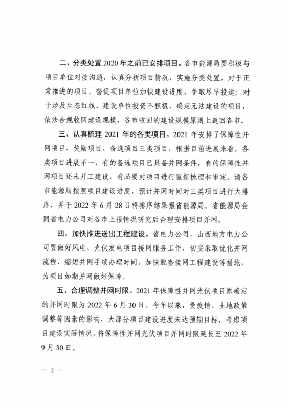 2021年保障性并網(wǎng)光伏項目原確定的并網(wǎng)時限為2022年6月30日。受疫情、土地政策 調(diào)整等因素的影響,將保障性并網(wǎng)光伏項目并網(wǎng)時限延長至2022年 9月30日。