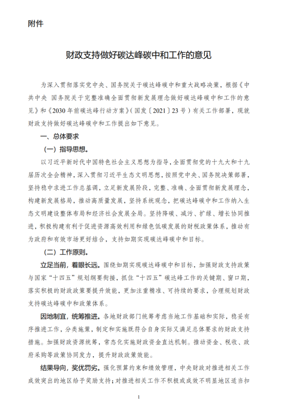 從整體來看,《意見》原則清晰,目標合理,支持領(lǐng)域精準,充分落實了“1+N”頂層文件要求,并實現(xiàn)了與“十四五”規(guī)劃的有效銜接。在重點支持領(lǐng)域上,基本覆蓋能源、工業(yè)、交通、循環(huán)經(jīng)濟、碳市場等我國“雙碳”工作重點實施領(lǐng)域;在措施上,強調(diào)激勵與約束機制并存,再提健全市場化多元化投入機制,繼續(xù)擴大社會資本參與面,解決“雙碳”發(fā)展過程中的資金需求問題。但《意見》作為財政領(lǐng)域“1+N”政策的頂層文件,內(nèi)容多以定性描述為主,并未設(shè)置具體的財政支持目標和力度,且在具體產(chǎn)業(yè)的支持上還存在不確定性。