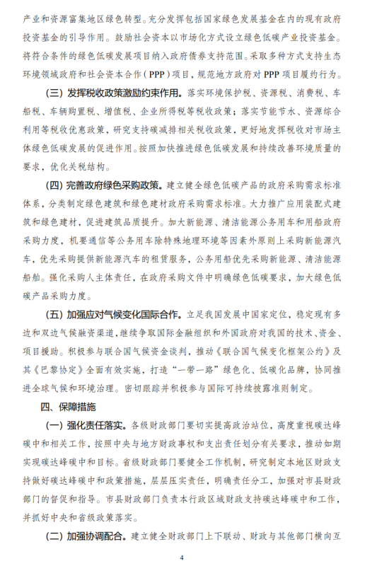 《意見》提到,立足當前,著眼長遠,圍繞如期實現(xiàn)碳達峰碳中和目標,加強財政支持政策與國家“十四五”規(guī)劃綱要銜接,抓住“十四五”碳達峰工作的關(guān)鍵期、窗口期,落實積極的財政政策要提升效能,更加注重精準、可持續(xù)的要求,合理規(guī)劃財政支持碳達峰碳中和政策體系。政策框架體系的建立是財政支持碳達峰碳中和工作的基礎(chǔ),《意見》主要立足當前發(fā)展階段,聚焦“十四五”時期政策體系框架初步建立目標,夯實我國碳達峰碳中和發(fā)展基礎(chǔ),同時著眼長遠,合理規(guī)劃和完善財政支持碳達峰碳中和政策體系,為如期實現(xiàn)碳達峰碳中和目標做好財政保障。