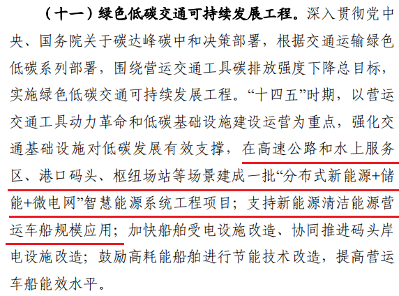 其中,綠色低碳交通可持續(xù)發(fā)展工程方面,“十四五”時期,以營運交通工具動力革命和低碳基礎(chǔ)設(shè)施建設(shè)運營為重點,強化交通基礎(chǔ)設(shè)施對低碳發(fā)展有效支撐,在高速公路和水上服務(wù)區(qū)、港口碼頭、樞紐場站等場景建成一批“分布式新能源+儲能+微電網(wǎng)”智慧能源系統(tǒng)工程項目;支持新能源清潔能源營運車船規(guī)模應(yīng)用。