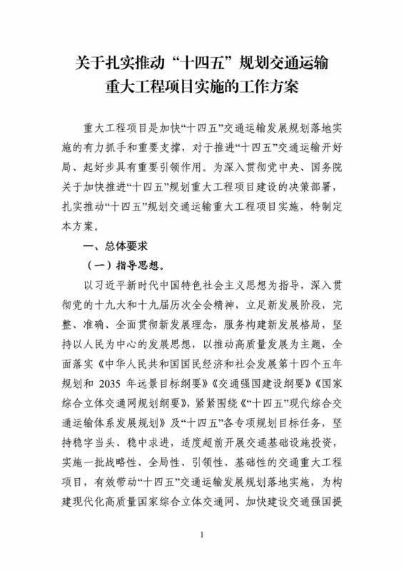 為深入貫徹黨中央、國務(wù)院關(guān)于加快推進“十四五”規(guī)劃重大工程項目建設(shè)的決策部署,經(jīng)交通運輸部同意,現(xiàn)將《關(guān)于扎實推動“十四五”規(guī)劃交通運輸重大工程項目實施的工作方案》印發(fā)給你們。請各單位各部門加強組織領(lǐng)導(dǎo),壓緊壓實責(zé)任,細化實化工作措施,認真抓好貫徹落實,確保交通運輸重大工程項目建設(shè)取得實效,為保持經(jīng)濟運行在合理區(qū)間、保持社會大局穩(wěn)定作出積極貢獻,以優(yōu)異成績迎接黨的二十大勝利召開。