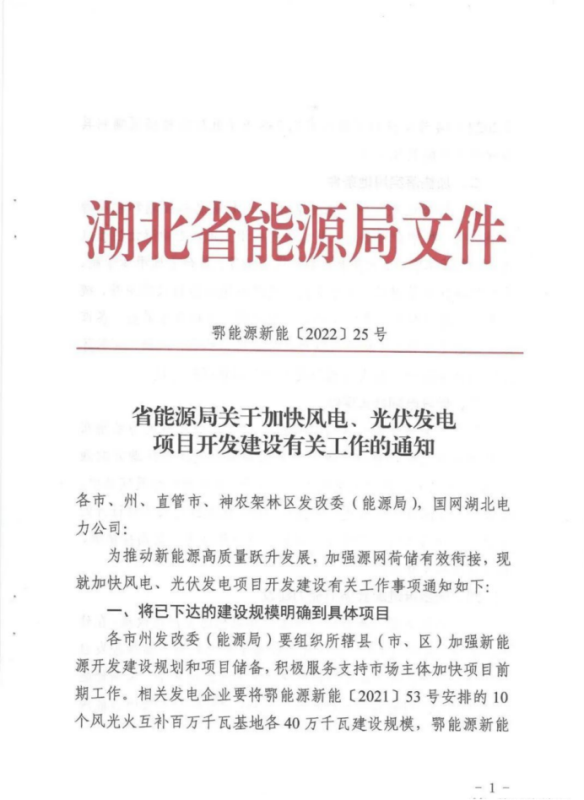 中國(guó)儲(chǔ)能網(wǎng)訊:5月26日,湖北省能源局發(fā)布了《省能源局關(guān)于加快風(fēng)電、光伏發(fā)電項(xiàng)目開發(fā)建設(shè)有關(guān)工作》的通知。