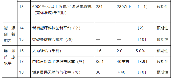 4.能源普惠水平不斷提升。電氣化水平持續(xù)提升,電能占終端用能比重達到40%左右。人均裝機2.0千瓦左右,居民人均生活用電1300千瓦時以上。城鄉(xiāng)居民天然氣氣化率達到40%以上,基本實現(xiàn)城鄉(xiāng)用能服務均等化。