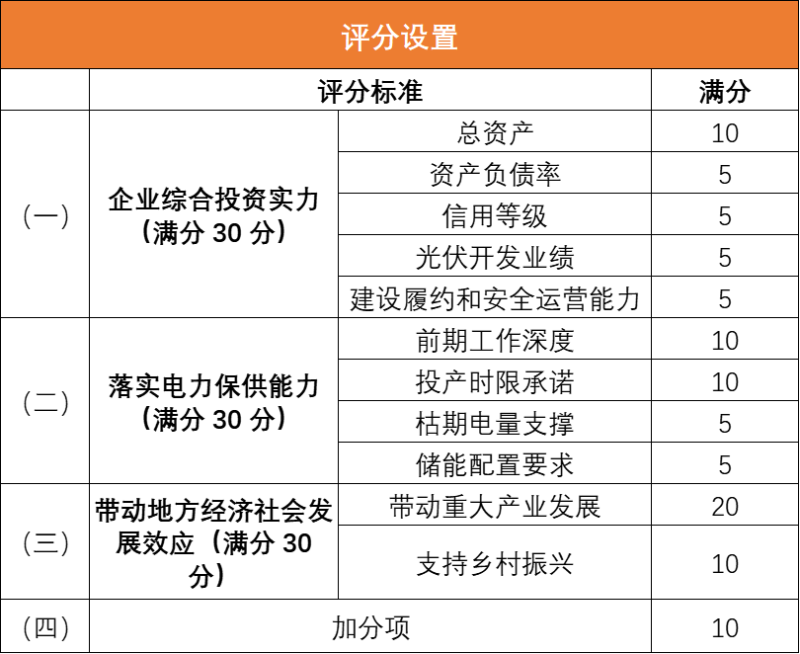 從評(píng)分設(shè)置來看,對(duì)申報(bào)企業(yè)將從從企業(yè)綜合投資實(shí)力、落實(shí)電力保供能力、帶動(dòng)地方經(jīng)濟(jì)社會(huì)發(fā)展效應(yīng)等方面打分考核。根據(jù)云南電力系統(tǒng)需要,分別從前期工作深度、投產(chǎn)時(shí)限承諾、枯期電量支撐、儲(chǔ)能配置要求等方面評(píng)價(jià)競(jìng)配企業(yè)落實(shí)電力保供能力。