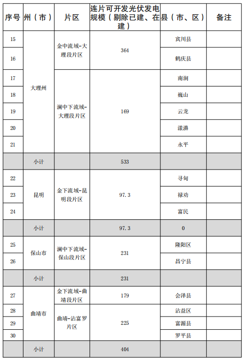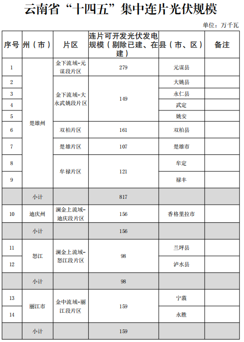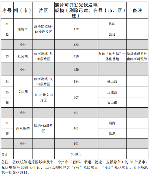 文件明確,根據(jù)云南省“十四五”可再生能源規(guī)劃,按照集中開發(fā)、規(guī)?;_發(fā)原則,以光伏資源豐富的縣(市、區(qū))為劃分基礎(chǔ),形成省級(jí)統(tǒng)籌管理的19個(gè)連片光伏資源區(qū),涉及十二個(gè)州市(普洱、昭通、德宏、玉溪除外)的38個(gè)縣市,光伏規(guī)模為3639萬千瓦。已開工規(guī)模包含“8+3”光伏項(xiàng)目、“445”光伏項(xiàng)目、金下基地第一批光伏項(xiàng)目。