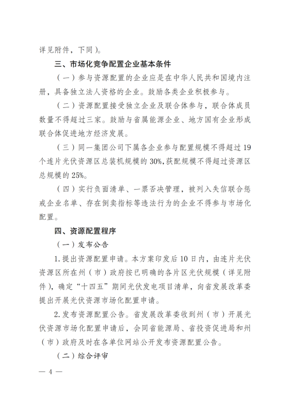 另外,征求意見函中要求申報(bào)企業(yè)同一集團(tuán)公司下屬各企業(yè)參與配置規(guī)模不得超過19個(gè)連片光伏資源區(qū)總裝機(jī)規(guī)模的30%,獲配規(guī)模不得超過資源區(qū)總規(guī)模的25%。資源配置接受獨(dú)立企業(yè)及聯(lián)合體參與,聯(lián)合體成員數(shù)量不得超過三家。