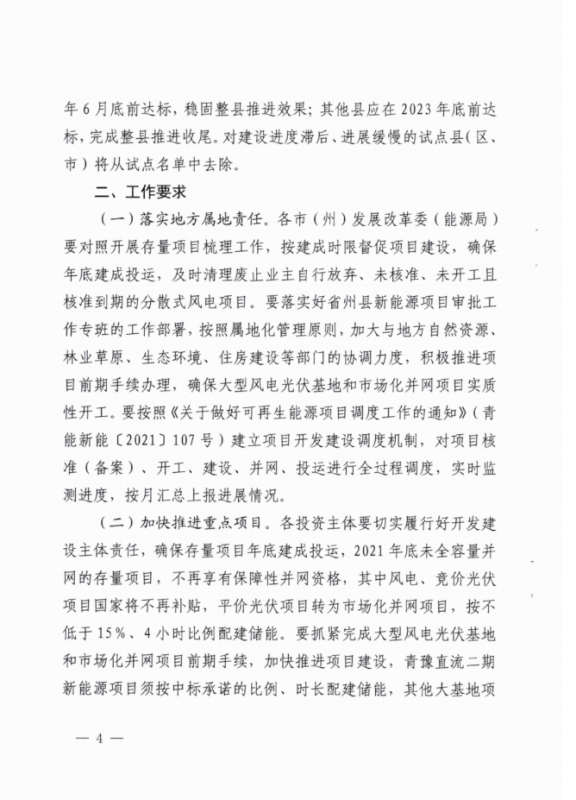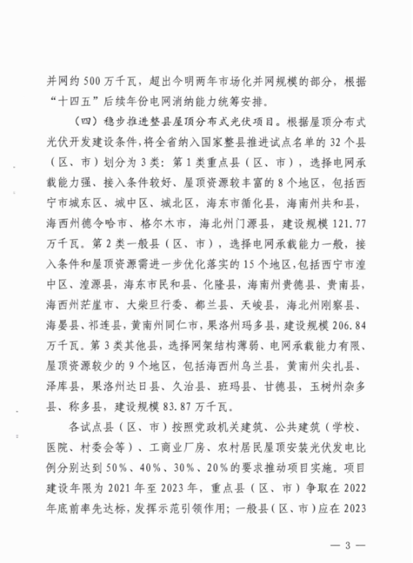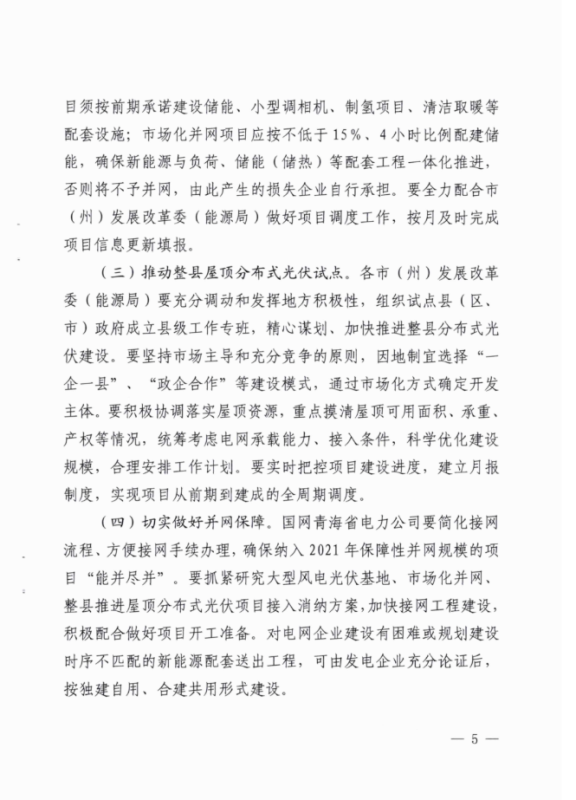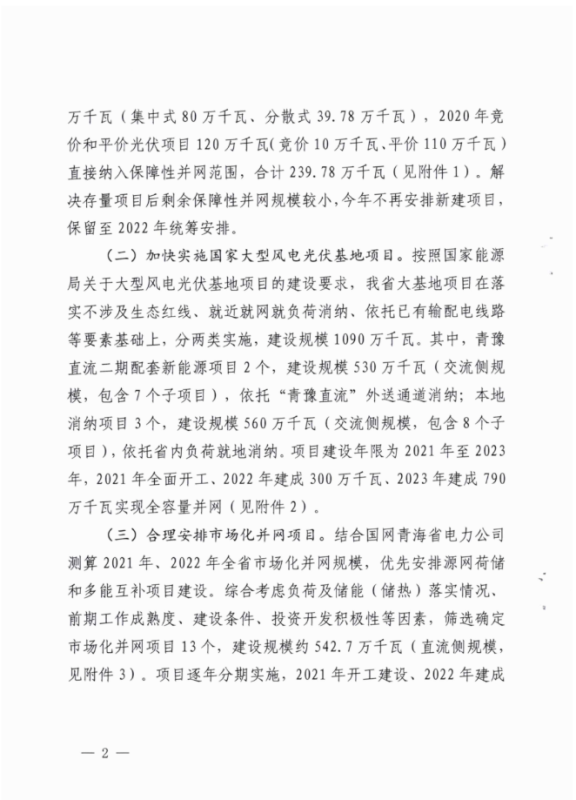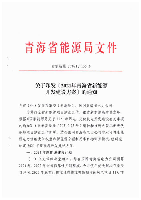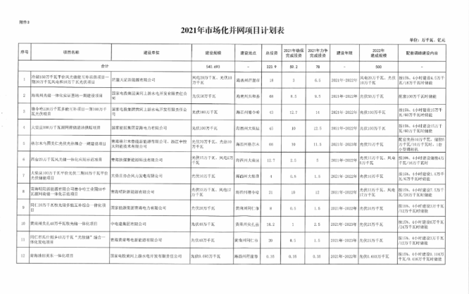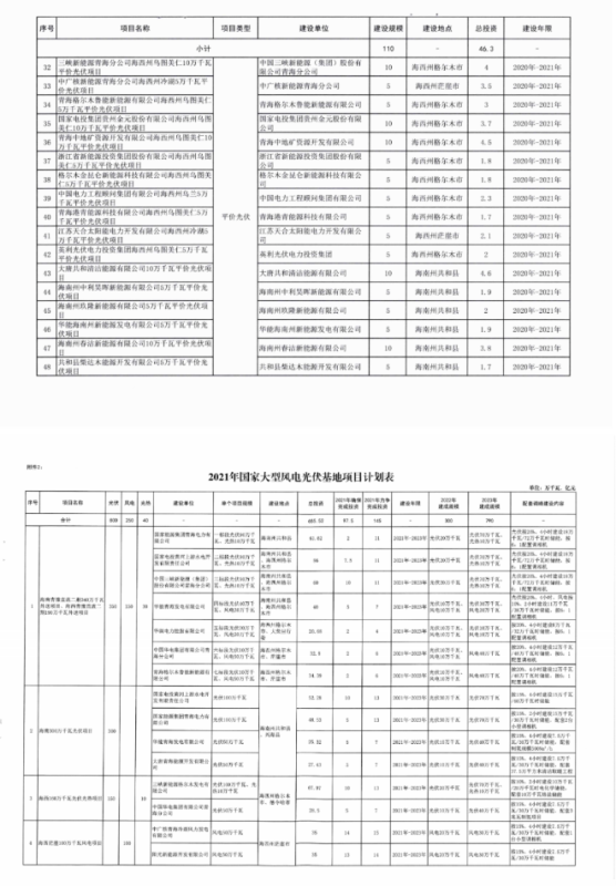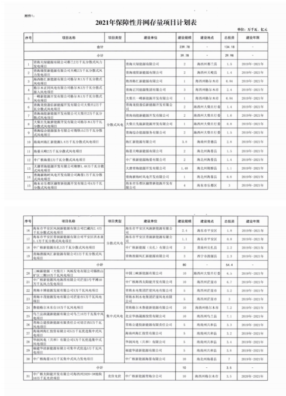 中國儲能網(wǎng)訊:根據(jù)近期獲悉的《2021年青海省新能源開發(fā)建設(shè)方案》,青海省2021年新能源建設(shè)計劃要求(1)優(yōu)先保障存量項目。2020年底前已核準(zhǔn)且在核準(zhǔn)有效期內(nèi)的風(fēng)電項目119.78萬千瓦(集中式80萬千瓦,分散式39.78萬千瓦),光伏項目120萬千瓦(競價10萬千瓦、平價11萬千瓦)。解決存量項目后剩余保障性并網(wǎng)規(guī)模較小,2021年不安排新建項目,保留至2022年統(tǒng)籌安排。(2)加快實施國家大型風(fēng)電光伏基地項目。青海省大基地項目分兩類實施,建設(shè)規(guī)模1090萬千瓦。其中,青豫直流二期配套新能源項目規(guī)模為530萬千瓦(交流側(cè)規(guī)模,包含7個子項目);本地消納項目3個,建設(shè)規(guī)模560萬千瓦。依托省內(nèi)負(fù)荷就地消納,項目建設(shè)年限為2021-2023年,2021年全面開工、2022年建成300萬千瓦、2023年建成790萬千瓦實現(xiàn)全容量并網(wǎng)。(3)合理安排市場化并網(wǎng)項目。優(yōu)先安排源網(wǎng)荷儲和多能互補項目建設(shè),篩選確定市場化并網(wǎng)項目13個,建設(shè)規(guī)模約542.7萬千瓦。項目逐年分期實施,2021年開工建設(shè)、2022年建成并網(wǎng)約500萬千瓦,超出2021-2022年市場化規(guī)模的項目,根據(jù)“十四五”后續(xù)年份電網(wǎng)消納能力統(tǒng)籌安排。(4)穩(wěn)步推進(jìn)整縣屋頂分布式光伏項目。根據(jù)文件,市場化并網(wǎng)項目要按照不低于15%、4小時比例配建儲能。對電網(wǎng)企業(yè)建設(shè)有困難或規(guī)劃建設(shè)時序不匹配的新能源配套送出工程,可由發(fā)電企業(yè)充分論證后,按獨建自用、合建共用形式建設(shè)。