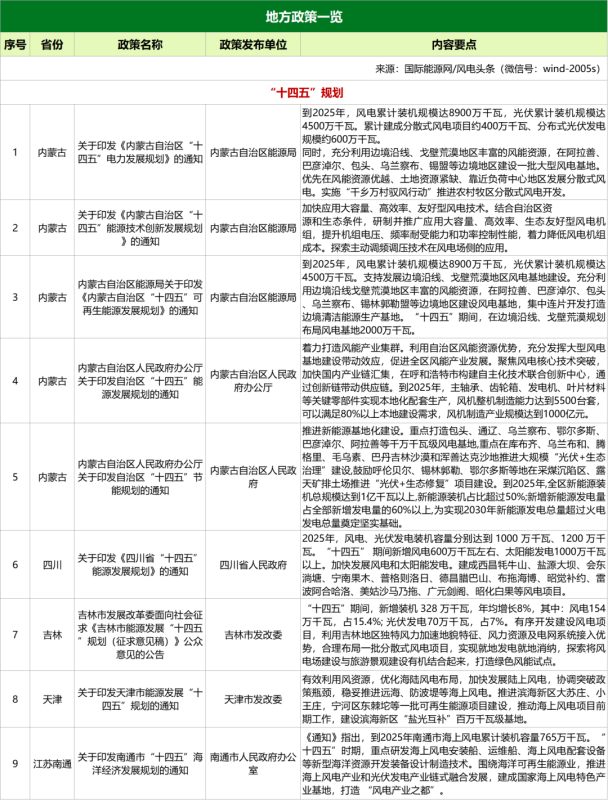 其中,內(nèi)蒙古在“十四五”可再生能源發(fā)展規(guī)劃中明確指出,內(nèi)蒙古到2025年,風(fēng)電累計(jì)裝機(jī)規(guī)模達(dá)8900萬千瓦,光伏累計(jì)裝機(jī)規(guī)模達(dá)4500萬千瓦。支持發(fā)展邊境沿線、戈壁荒漠地區(qū)風(fēng)電基地建設(shè)。充分利用邊境沿線戈壁荒漠地區(qū)豐富的風(fēng)能資源,在阿拉善、巴彥淖爾、包頭、烏蘭察布、錫林郭勒盟等邊境地區(qū)建設(shè)風(fēng)電基地,集中連片開發(fā)打造邊境清潔能源生產(chǎn)基地。“十四五”期間,在邊境沿線、戈壁荒漠規(guī)劃布局風(fēng)電基地2000萬千瓦。