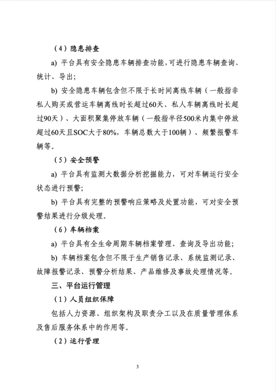 (一)強(qiáng)化組織保障。企業(yè)要明確新能源汽車安全管理的負(fù)責(zé)部門(mén),統(tǒng)籌推進(jìn)本企業(yè)安全體系建設(shè)。建立健全產(chǎn)品質(zhì)量安全責(zé)任制,嚴(yán)格落實(shí)主要負(fù)責(zé)人、分管負(fù)責(zé)人和相關(guān)業(yè)務(wù)部門(mén)的產(chǎn)品質(zhì)量安全責(zé)任。完善產(chǎn)品研發(fā)設(shè)計(jì)、生產(chǎn)制造、運(yùn)行監(jiān)測(cè)、售后服務(wù)、事故響應(yīng)處置、網(wǎng)絡(luò)安全等方面的安全管理制度規(guī)范。