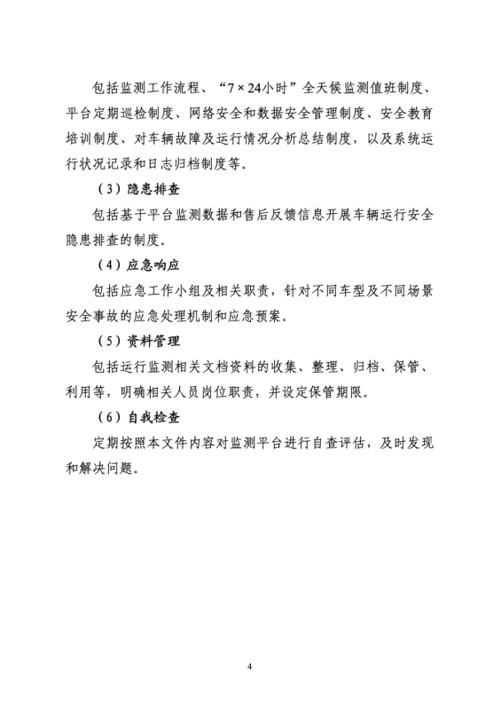 (九)建立隱患車輛排查機(jī)制。鼓勵(lì)企業(yè)加強(qiáng)車輛運(yùn)行安全狀態(tài)隱患排查,及時(shí)跟蹤和確認(rèn)長(zhǎng)時(shí)間離線車輛的安全狀態(tài),妥善處理大面積聚集停放、頻繁報(bào)警等存在安全隱患的車輛。