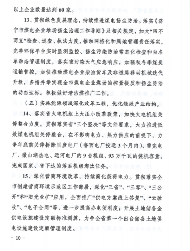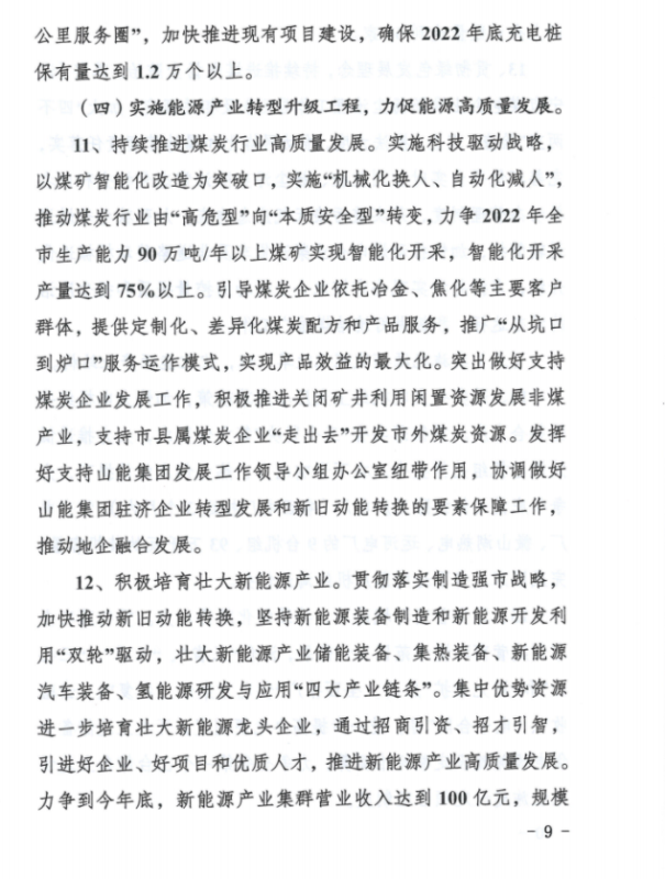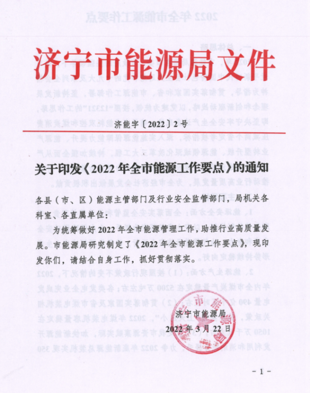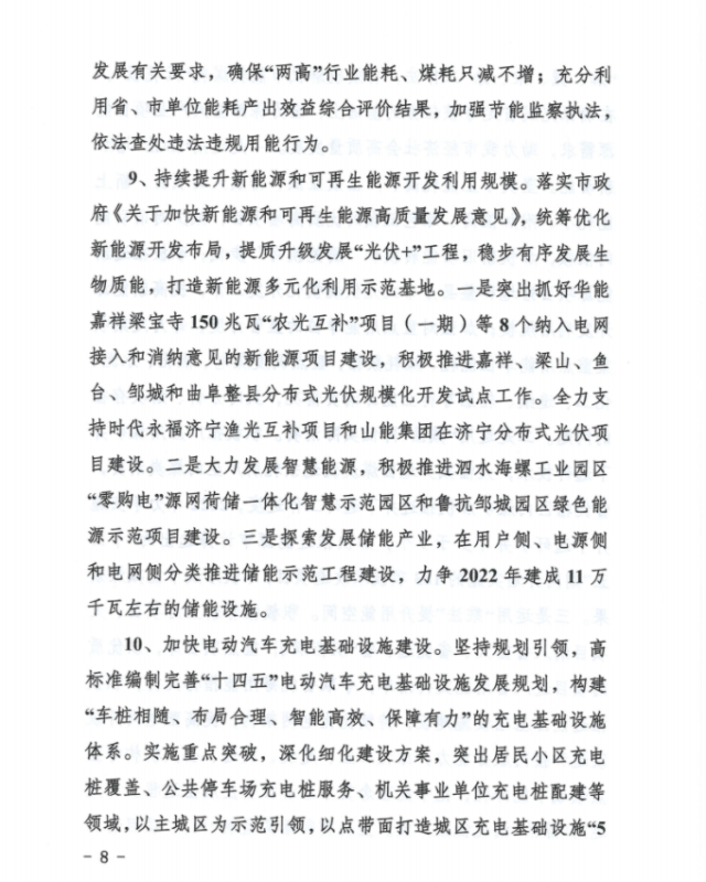 持續(xù)提升新能源和可再生能源開發(fā)利用規(guī)模。落實(shí)市政府《關(guān)于加快新能源和可再生能源高質(zhì)量發(fā)展意見》,統(tǒng)籌優(yōu)化新能源開發(fā)布局,提質(zhì)升級(jí)發(fā)展“光伏+”工程,穩(wěn)步有序發(fā)展生物質(zhì)能,打造新能源多元化利用示范基地。一是突出抓好華能嘉祥梁寶寺150兆瓦“農(nóng)光互補(bǔ)”項(xiàng)目(一期)等8個(gè)納入電網(wǎng)接入和消納意見的新能源項(xiàng)目建設(shè),積極推進(jìn)嘉祥、梁山、魚臺(tái)、鄒城和曲阜整縣分布式光伏規(guī)?;_發(fā)試點(diǎn)工作。全力支持時(shí)代永福濟(jì)寧漁光互補(bǔ)項(xiàng)目和山能集團(tuán)在濟(jì)寧分布式光伏項(xiàng)目建設(shè)。二是大力發(fā)展智慧能源,積極推進(jìn)泗水海螺工業(yè)園區(qū)“零購(gòu)電”源網(wǎng)荷儲(chǔ)一體化智慧示范園區(qū)和魯抗鄒城園區(qū)綠色能源示范項(xiàng)目建設(shè)。三是探索發(fā)展儲(chǔ)能產(chǎn)業(yè),在用戶側(cè)、電源側(cè)和電網(wǎng)側(cè)分類推進(jìn)儲(chǔ)能示范工程建設(shè),力爭(zhēng)2022年建成11萬千瓦左右的儲(chǔ)能設(shè)施。