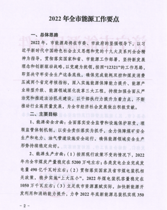 2、能源生產(chǎn)方面:(1)按照現(xiàn)行政策不變的情況下,2022年內(nèi)全市煤炭產(chǎn)量穩(wěn)定在5200萬噸左右;各類發(fā)電企業(yè)完成發(fā)電量490億千瓦時(shí)左右;(2)貫徹落實(shí)國(guó)家及省市煤電裝機(jī)相關(guān)政策,穩(wěn)步實(shí)施“上大壓小”,2022年煤電裝機(jī)容量穩(wěn)定在1050萬千瓦左右;(3)立足濟(jì)寧市資源稟賦實(shí)際,加快新能源開發(fā)利用和消納能力提升,力爭(zhēng)2022年底新能源總裝機(jī)實(shí)現(xiàn)350萬千瓦,新能源發(fā)電量完成45億千瓦時(shí)。