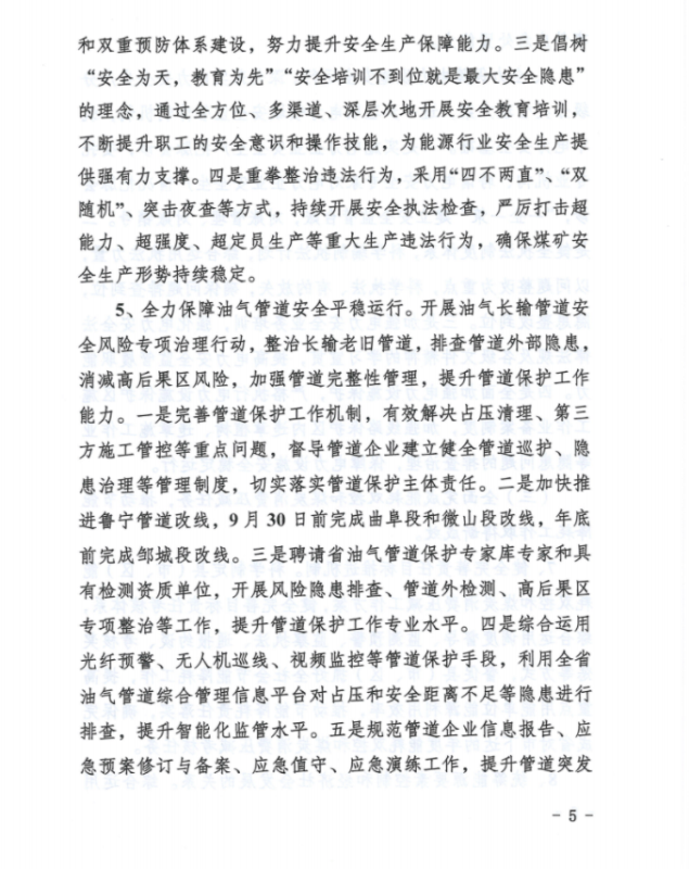 1、能源安全方面:全面落實(shí)安全監(jiān)管和設(shè)施保護(hù)職責(zé),理順監(jiān)管體制機(jī)制,以安全責(zé)任落實(shí)為抓手,全力保障煤礦安全生產(chǎn)和電力、油氣管道設(shè)施安全運(yùn)行,確保能源領(lǐng)域安全生產(chǎn)形勢(shì)持續(xù)穩(wěn)定向好。